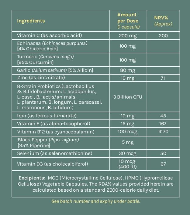 Essential Nutrients: Includes Vitamins C, D, B12, Zinc, Selenium, and Iron for immune function